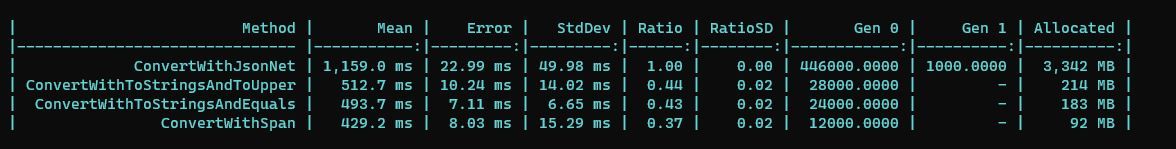 | ConvertWithSpan | 420.5 ms | 3.29 ms | 2.92 ms | 0.83 | 0.01 | 12000.0000 | 92 MB |